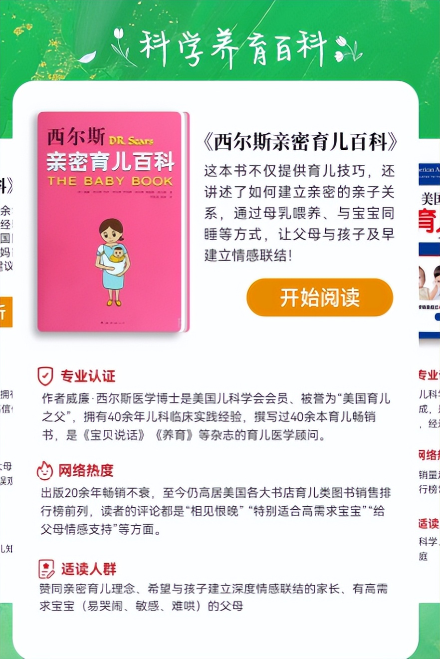 而在亲密关系和情绪引导上,《西尔斯亲密育儿百科》更是给了我很大的启发。它不是简单告诉你要不要抱、要不要哄,而是把“安全感”讲清楚:就比如靠近,是为了让孩子建立信任,而不是无底线纵容。对很多新手父母来说,焦虑的根源并不是怕孩子被宠坏,而是害怕自己失控。这本书恰恰帮我划清了边界,也让我在陪伴中更笃定。
