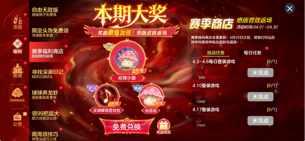 除此之外,赛季福利商店还上新了「粉茸小蘑」关键词和「粉菇菇」孢子,做任务就能免费兑换;爬塔活动每周都能领免费步数,助力大家冲榜;还有深渊入侵、传奇之战新赛季、首周冲刺福利等活动同步开启,奖励拿到手软。