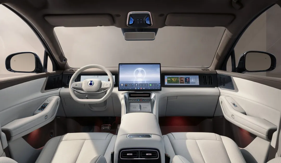 内饰方面,腾势N8L的中控台布局与腾势N9较为接近,配备13.2英寸液晶仪表+17.3英寸中控屏+13.2英寸副驾屏,换装全新双辐式多功能方向盘,搭配怀挡式换挡机构,副仪表台的前端为物理按键、中间为两个手机无线充电面板、带盖板的杯托等,下方为镂空的储物容纳空间。