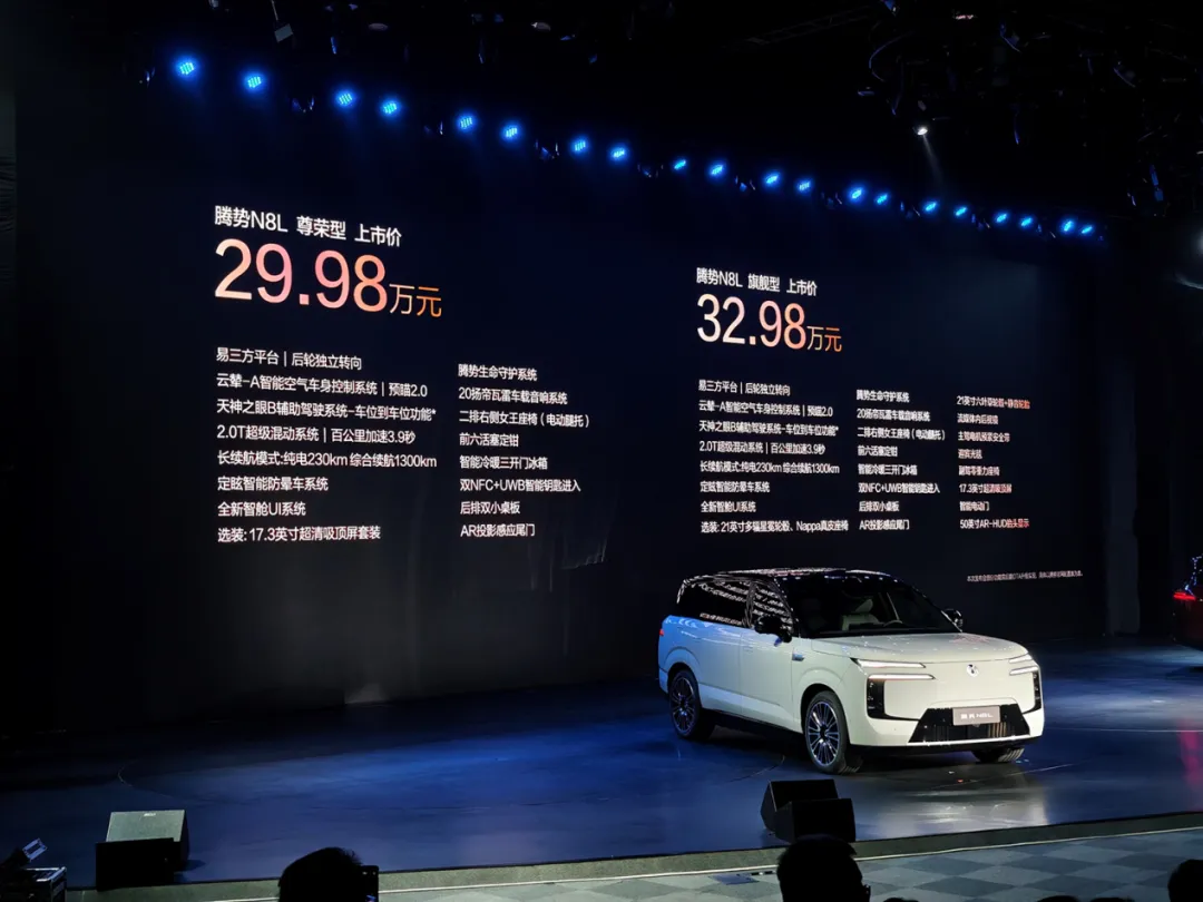 近日,腾势N8L正式上市,两款款车型的官方售价为29.98-32.98万元。新车采用家族式最新设计,全系6座布局,基于易三方技术平台打造,搭载2.0T三电机插混系统,馈电油耗低至6.95L/100km,匹配容量为46.992千瓦时电池组,WLTC纯电续航里程为170km。