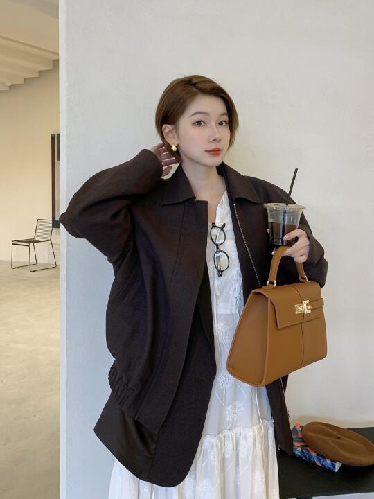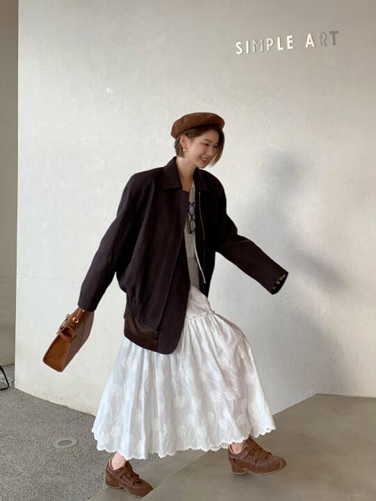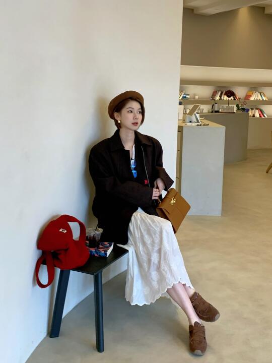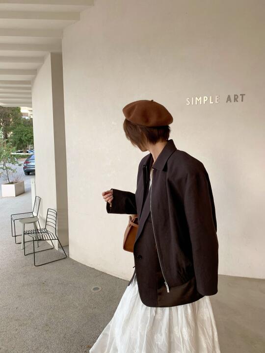 这种长度的短发好像就只能戴贝雷帽👩🏻🎨 工装感的大大外套 配白色裙子好适合 梯形包和德训鞋也蛮时髦的 快上班咯 这套还挺适合穿去学校滴