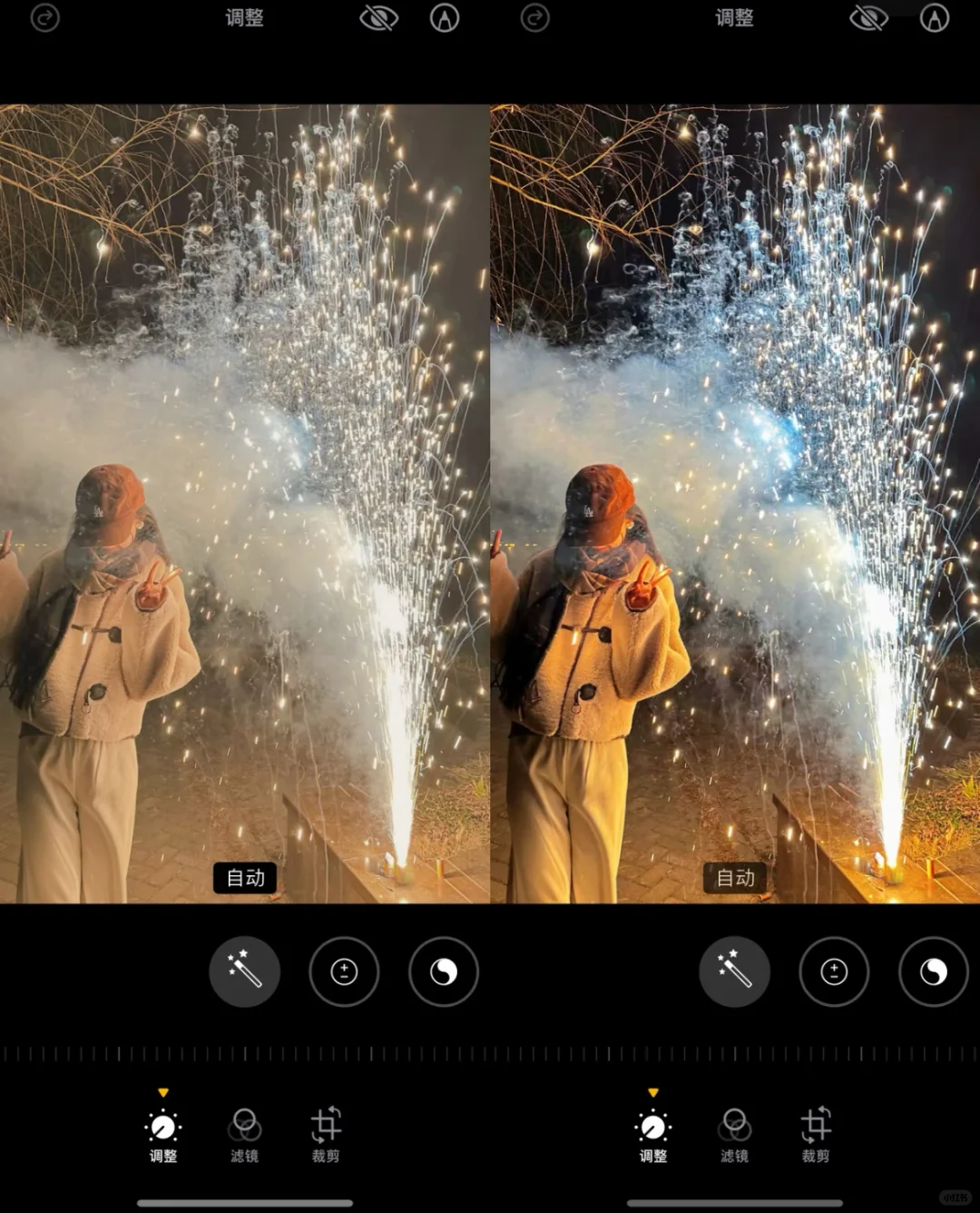 烟花调色真的太有氛围感了!让你一招废铁变王者! iPhone原相机调色 曝光28 鲜明度23 阴影一23 亮度23 饱和度23 色温15 清晰度46