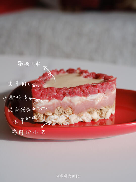 蛋糕材料:猫条、牛肉、鸡肉、混合猫饭、冻干。