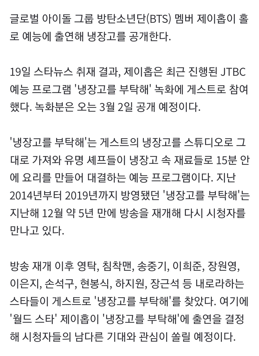 J-Hope 近日参与录制了 JTBC 综艺节目《拜托了冰箱》,以嘉宾身份出演。