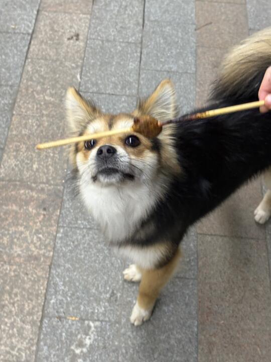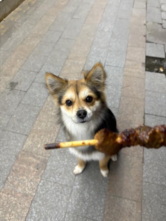 因为肉有点硬,我们挑软的肉,把调料去掉再给小黑,小黑吃的很香,跟着吃了五六串。