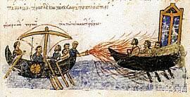 公元 678 年,阿拉伯人第一次发起了对于君士坦丁堡的围攻。东罗马舰队出海与阿拉伯人的舰队展开决战,并用他们的新武器“希腊火”彻底击溃了对方。“希腊火”当遇水的时候,火势反而会更加猛烈,并几乎不可能被扑灭。“希腊火”无论接触到什么物体的表面,都会附着在上面。“希腊火”燃烧的时候,还会发出巨大的轰鸣声,并产生大量的黑烟。