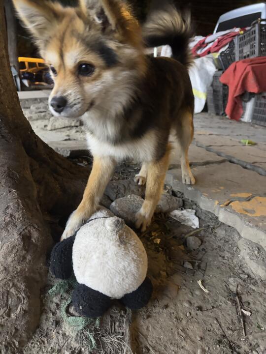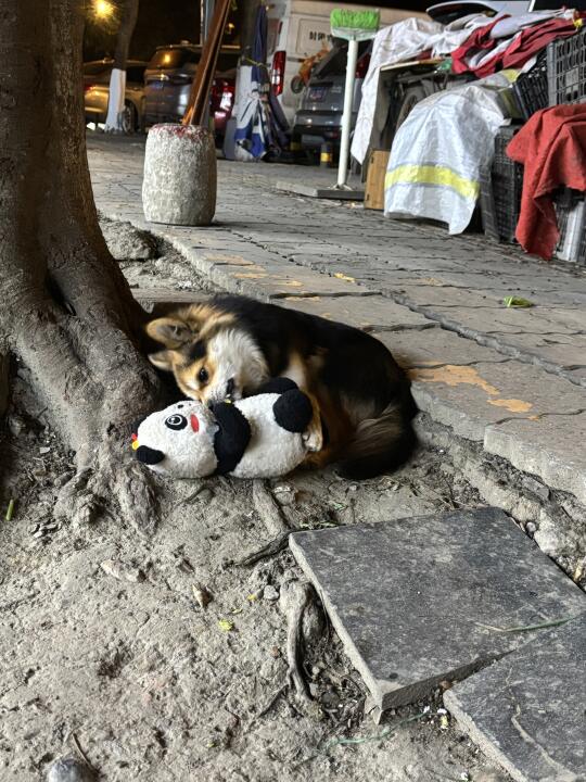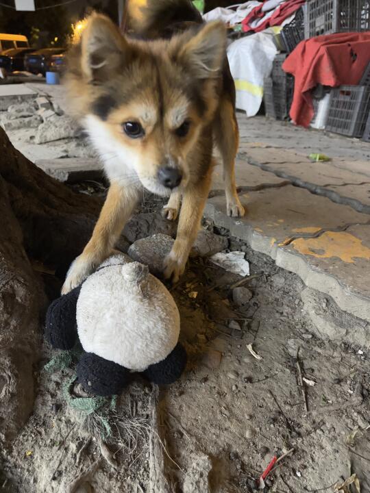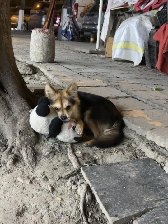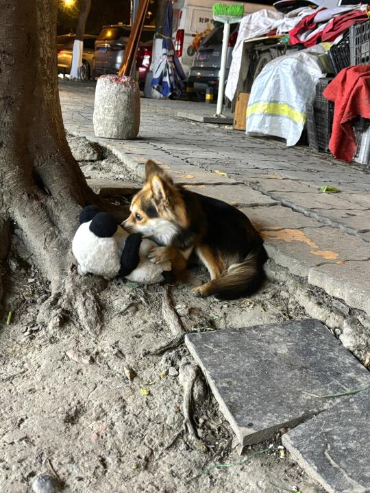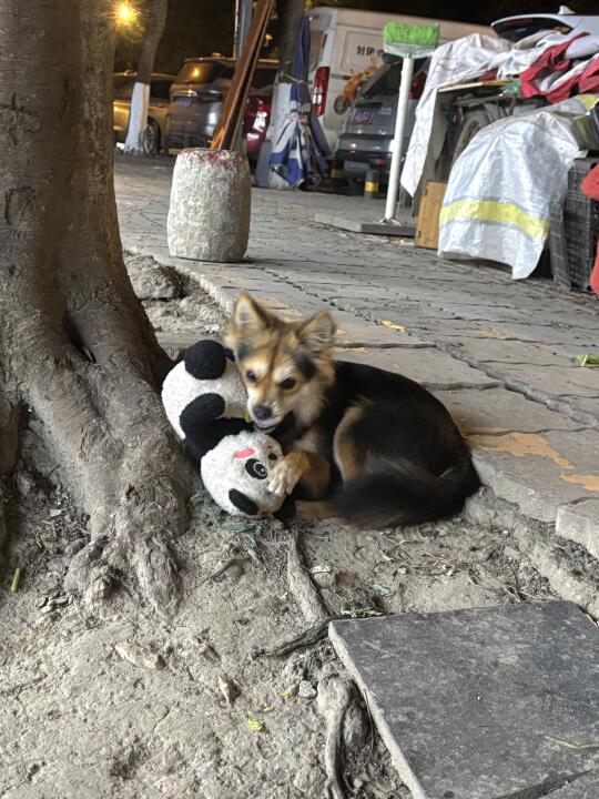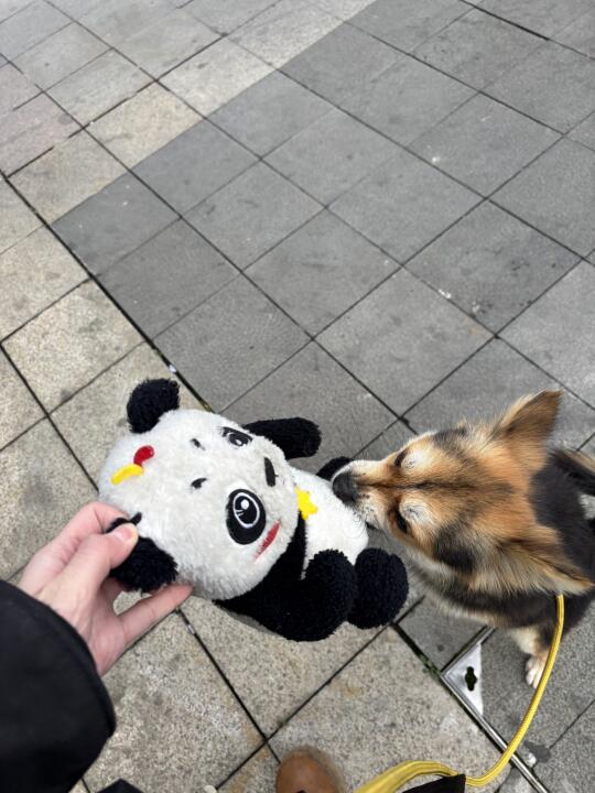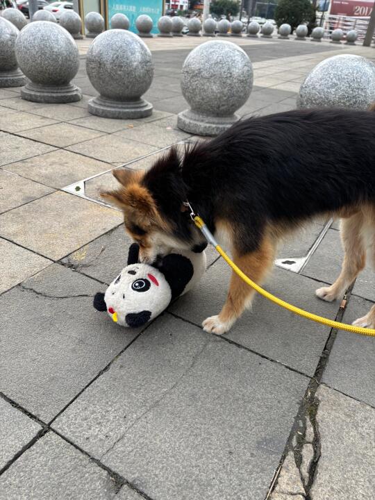 小黑和我散步出门就捡到了熊猫玩具一个,不过熊猫玩具太大他太小,没办法长期叼着