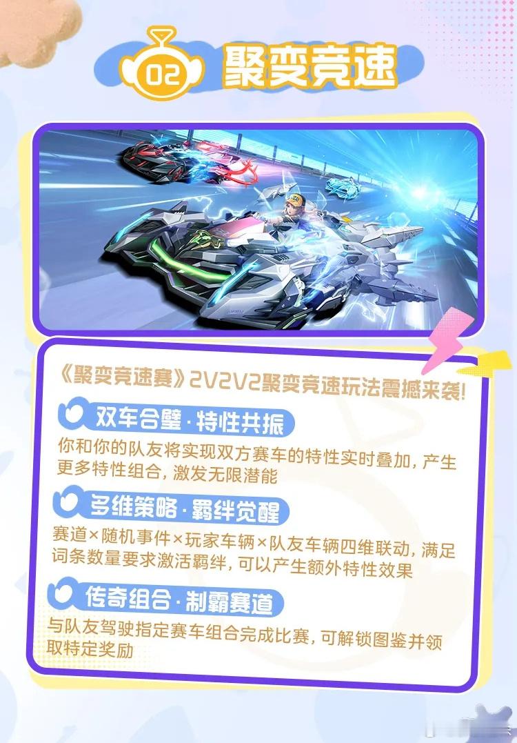 ②2V2V2聚变竞速模式,双车合并,赛车特性叠加四维联动,融合了几个模式的玩法。