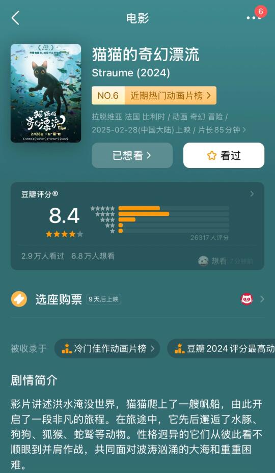 电影还被奥斯卡提名了最佳动画长片,不知道有没有机会角逐一下最佳男演员奖呢? 开玩笑的啦哈哈哈🤣 今年最期待的动画长片,全片没有一句台词,主角就是一只猫咪和一群小动物们,看预告片已经期待值拉满了!烂番茄新鲜度97%,爆米花指数98%,大概率会是养猫人/养宠人今年不能错过的一部电影[喝奶茶R] 被小猫治愈的点点瞬间,总会化作黑夜里的星光,藏在小猫爱意的眼眸里。感谢小猫的陪伴! (感谢上海,好期待和寿司一起去电影院看这部电影啊🎞️)