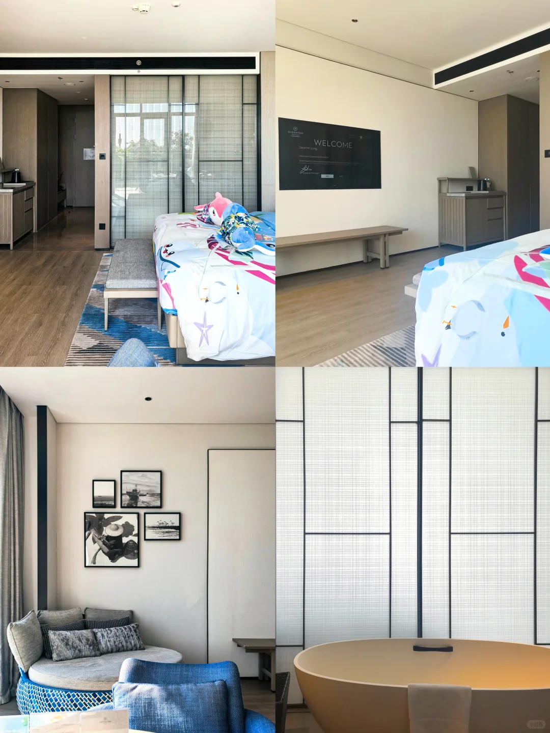 亲子房和普通房型其实没多少区别就是装饰不同,但感觉国内新开的喜来登越来越往欧美大车店方向靠拢房间完全没有质感,备品也是统一的喜来登大瓶+川宁茶包。欢迎水果很丰富。