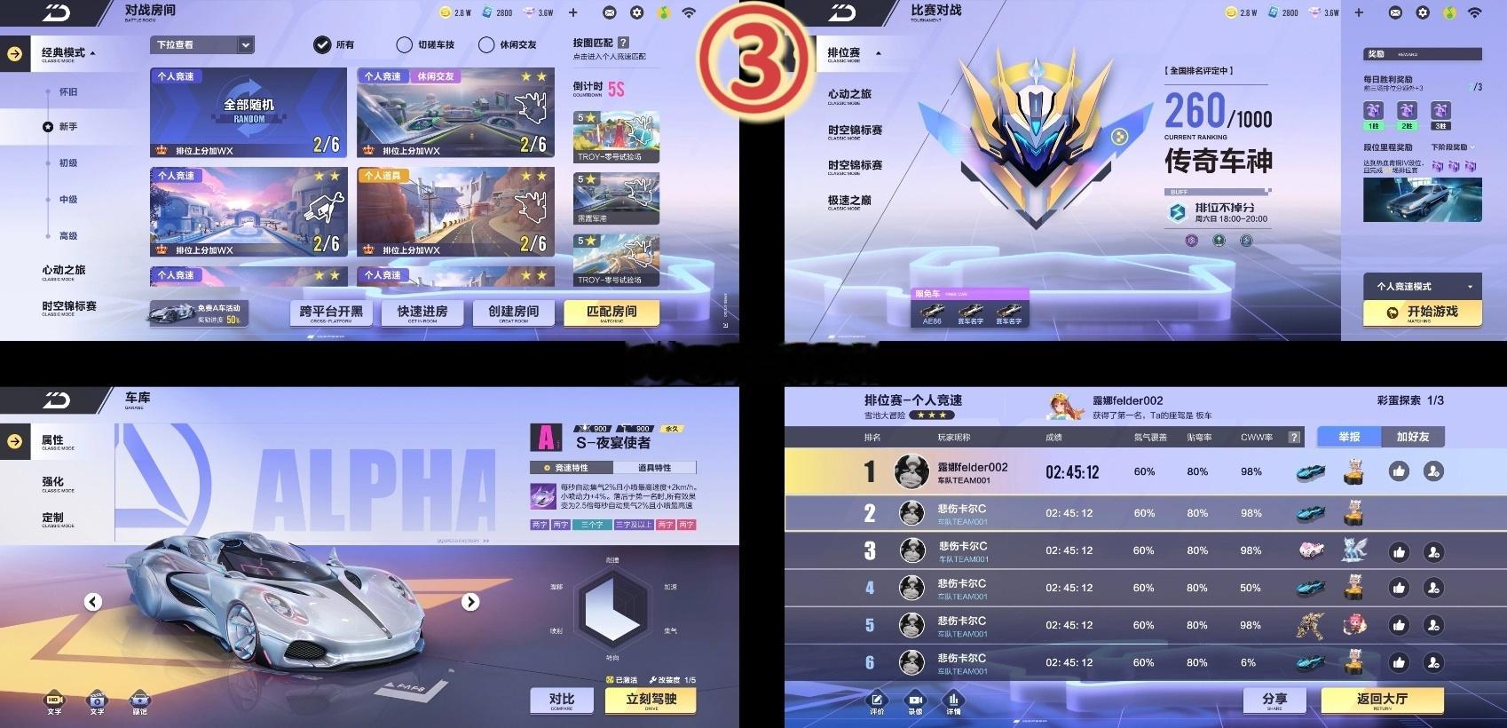 新UI视觉美术风格测试。有3套界面设计,包括车神图标、大厅按钮布局等,主要区别在色彩上。