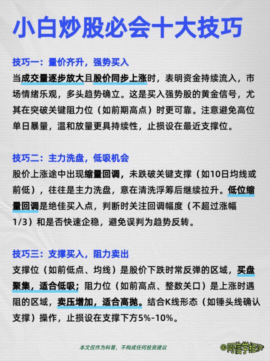 [彩虹R]小白炒股必会十大技巧! [钱袋R]股市变幻莫测,小白更需要学习一些必会技巧,才有可能提高长期胜率! [电影R]十大技巧如下:(详情看图👆) 技巧一:量价齐升,强势买入 技巧二:主力洗盘,低吸机会 技巧三:支撑买入,阻力卖出 技巧四:突破缺口不补,强势追涨 技巧五:高位放量滞涨,果断卖出 技巧六:MACD底背离,反弹可期 技巧七:板块轮动,抓热点龙头 技巧八:均线金叉,趋势转强 技巧九:资金流向定方向,大单为王 技巧十:定纪律止损,保住本金❗️❗️❗️