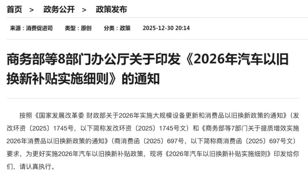 2026年在申请条件和执行细节上也设置了更严格的规定,。无论是报废还是置换,所涉及的旧车必须于2025年1月8日前登记在申请人名下。这意味着短期持有套补贴不再可行。