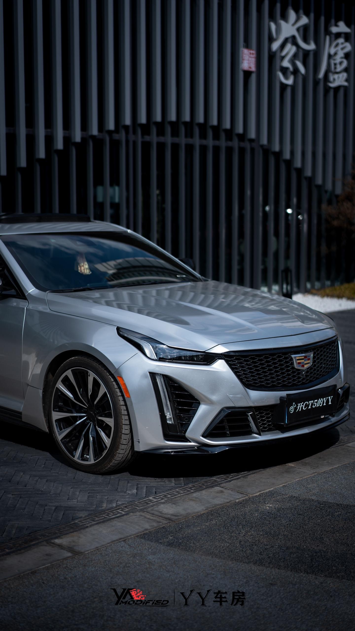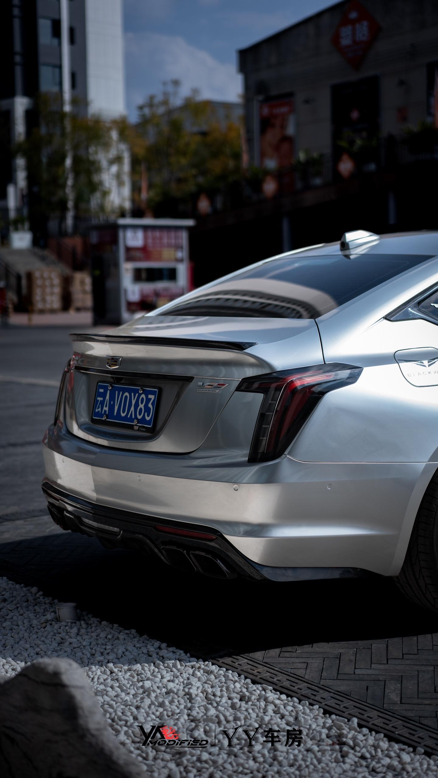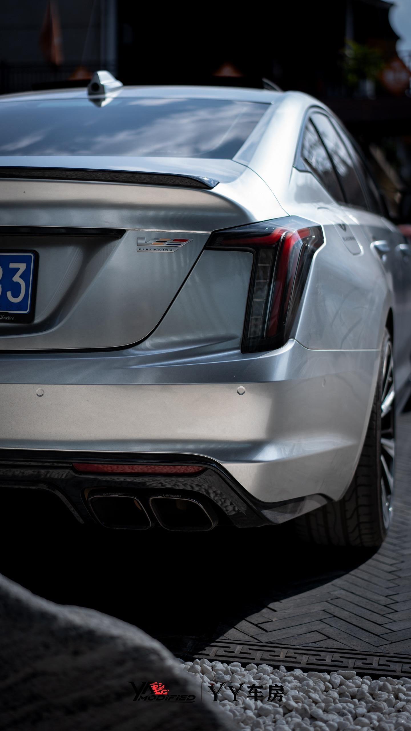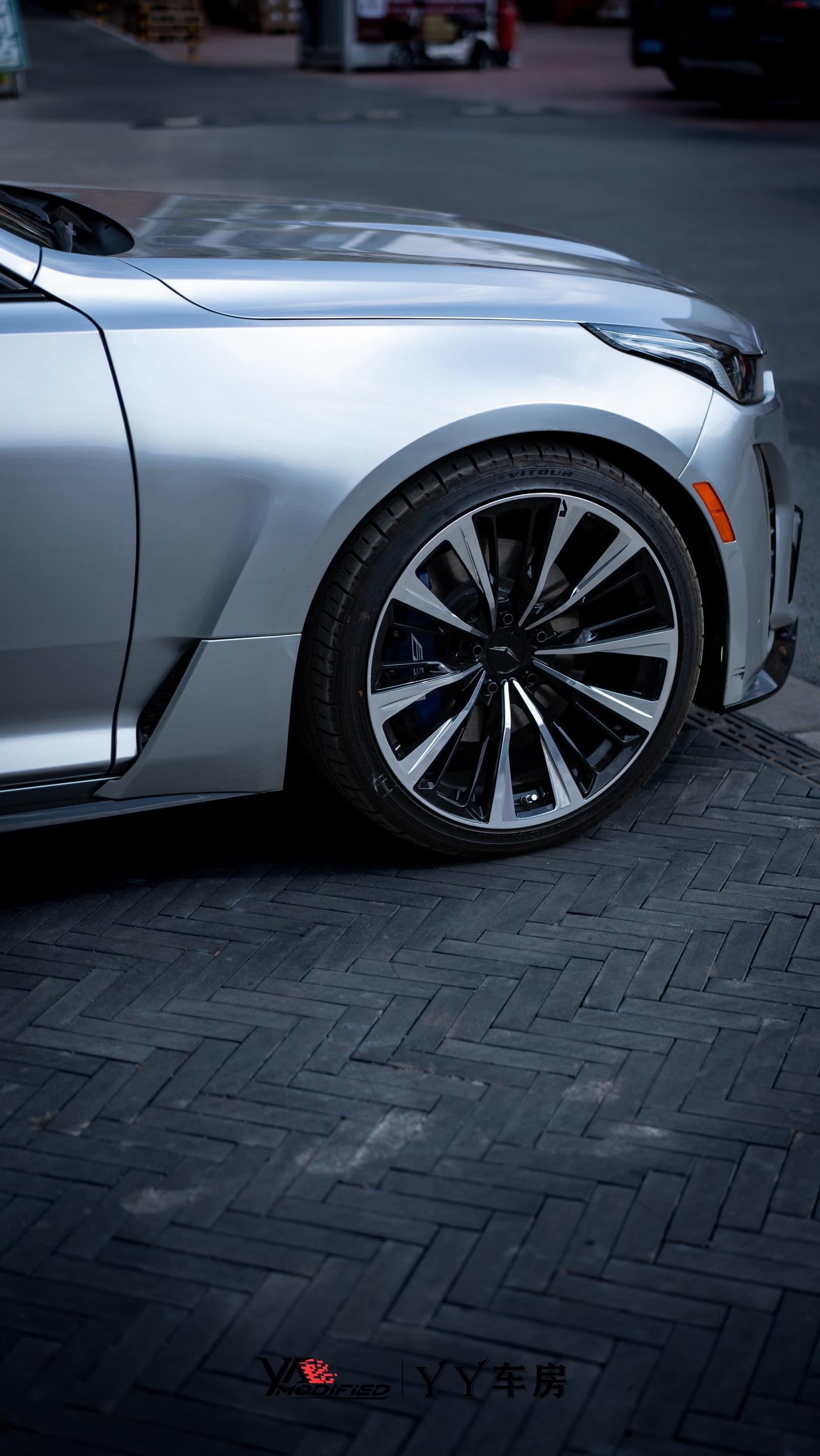 黑翼一比一包围,自带宽体,增加了车身的宽度呢,自然就能降低整个车子的视觉重心,带来的效果也很直接,更加的稳定和运动了~ 再加上配套的黑翼叶子板,也就是对黑翼最好的还原!GT银的车身颜色,在阳光下真的很惊艳!独特的金属质感,冷酷的色调,在阳光下能让整个车身的线条更加鲜明,本来ct5的设计就是有棱有角充满肌肉感的,搭配上GT银,可以说是把优点放大到了极致!最后重点来啦!20寸的黑翼精抛V轮!20寸上车,对比原车18寸的小轮毂