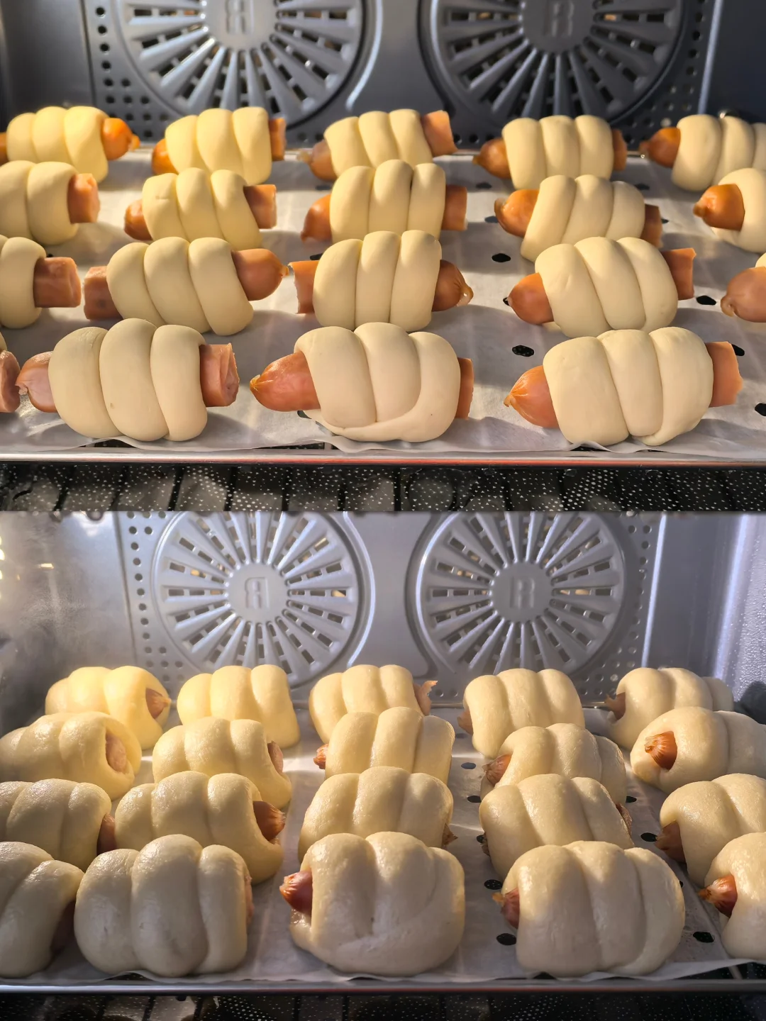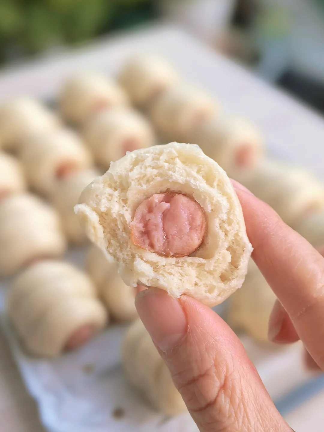 [庆祝R]孩子早餐不知道吃啥?试试这个中式火腿卷,白白胖胖的,一口一个,孩子超爱! [庆祝R]食材简单,只需要普通面粉、水、酵母和火腿肠,没有糖,没有盐,火腿肠可以选择信得过的品牌,让孩子吃的安全。 [庆祝R]选择周末或者提前一个晚上,只要一次发酵,1个小时就能轻松搞定。 [庆祝R]建议多做点,可以冷冻好,早上拿出来微波炉叮一下就行,再也不用担心孩子起晚没时间吃早饭了啦! [彩虹R]配方: 中筋面粉:250克 | 水:130克 | 酵母:3克 | 火腿肠:10根 [彩虹R]操作步骤: 1. 所有材料倒入面包机内,选择 “饺子皮”菜单或者其他揉面菜单,15分钟,揉成光滑的面团。(也可以用手揉,和做馒头一样,只要揉到形成光滑面团就行) 2. 将面团分成分成20个小剂子,每个19克左右。 3. 将10根火腿肠一切为二,每个小剂子搓成火腿肠的3倍长。 4. 将长条面团绕着火腿卷三圈。 5. 放入蒸箱或者蒸笼里发酵30分钟。(冬天蒸笼里可将水烧开至受热即可,夏天不用) 6. 当面团发到1.5倍大时,蒸箱开蒸汽模式,蒸笼冷水上锅蒸20分钟,完成后过5分钟开门或者开盖即可。