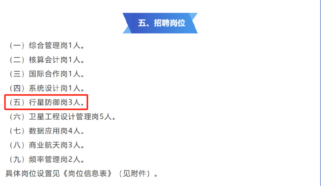 近期,一份公开招聘信息吸引外界注意。国家国防科技工业局重大专项工程中心,面向社会公开招聘21名工作人员,其中就包括“行星防御岗”3人,要求硕士以上学历,专业涉及天文、航天等。
