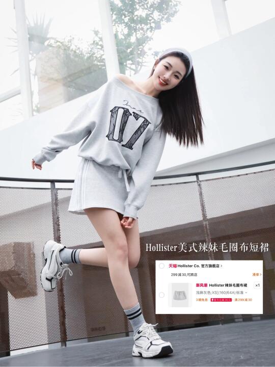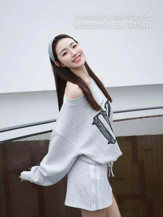 🩷第二套用露肩卫衣搭配了一条运动风短裙,