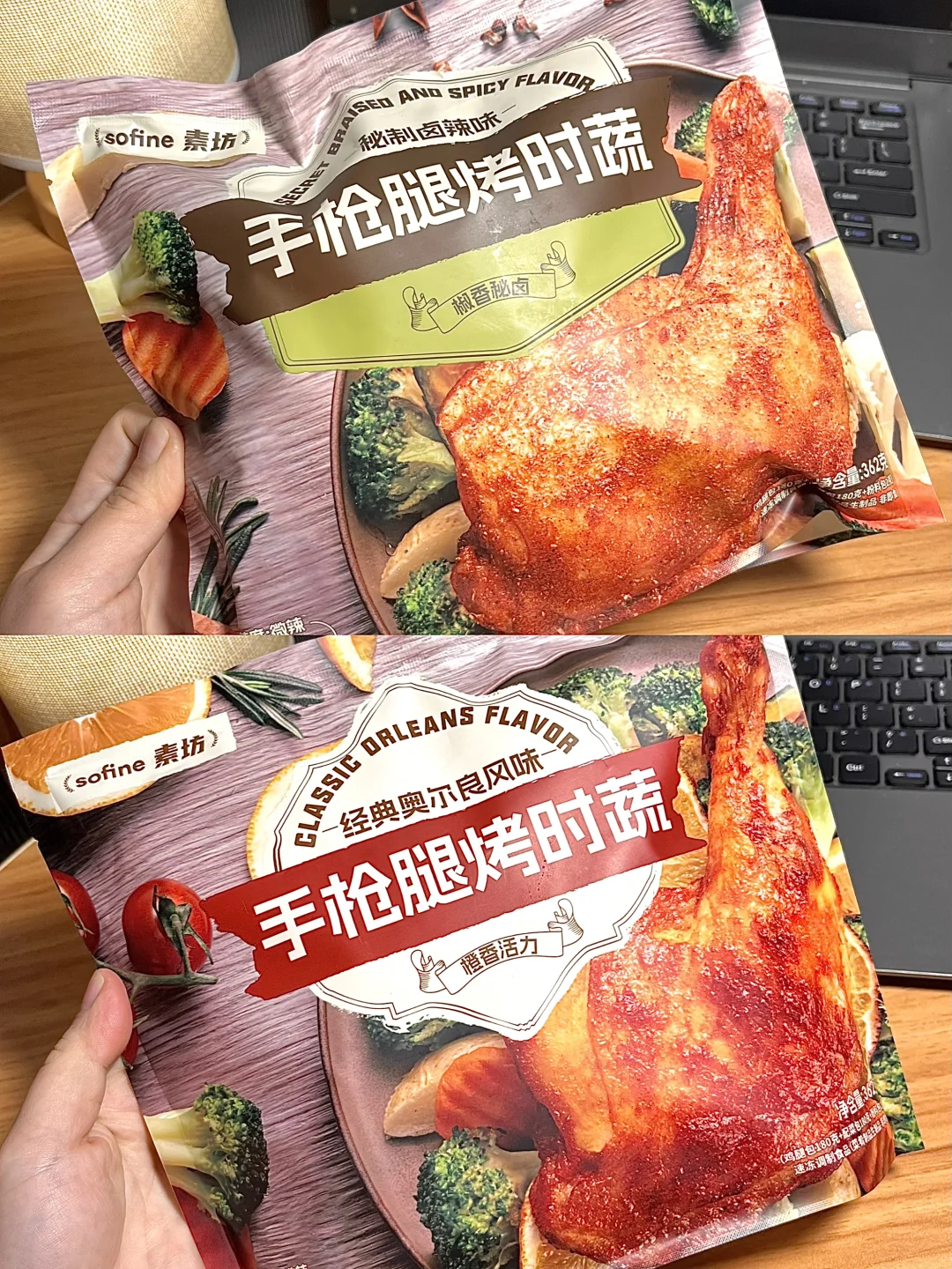 就是这个手枪腿烤时蔬! 管理期终于不用往嘴里塞那些难吃的水煮菜了! 空气炸锅/微波炉十几分钟就能get的手枪腿烤时蔬真的好吃到了我的心巴上...🤤 👍🏻比我拳头还大的手枪腿🍗,丢入空气炸锅180°8分钟,再把时蔬包丢进去再烤8分钟,最后撒上调料粉就能吃啦🥹 还是两个口味!最喜欢奥尔良的,满满的橙子香气,一口下去每一丝肉都被腌的很入味!!!感觉鸡肉还会爆汁水🤤巨嫩的肉肉! 时蔬烤的也会比煮的那种水唧唧的好吃很多~一餐一包就尊嘟很方便!!!家人们快去试试!