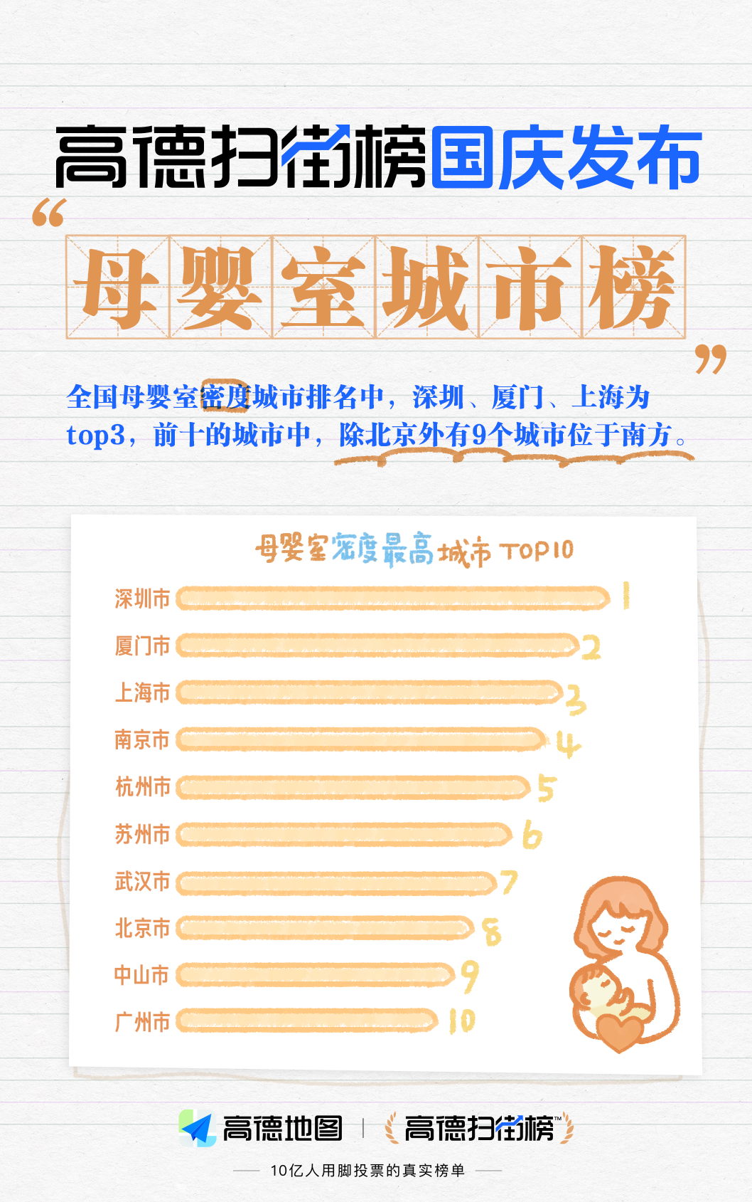 10月2日,高德扫街榜发布全国城市公厕数量榜与密度榜、母婴室友好城市榜。从分布看,公共厕所及母婴室,都呈现南多北少、南密北疏特点。北京公厕数量第一,深圳公厕和母婴室密度都最高,成都的公厕最繁忙。