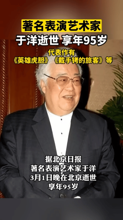 著名表演艺术家于洋先生于3月1日晚在北京逝世,享年95岁。他的一生为电影艺术做出了杰出贡献,塑造了众多经典角色,深受观众喜爱。他的离世让影迷们深感惋惜,但他的艺术成就和精神将永远铭刻在人们心中。影坛巨匠安息 我爱的老戏骨 分享电影老演员