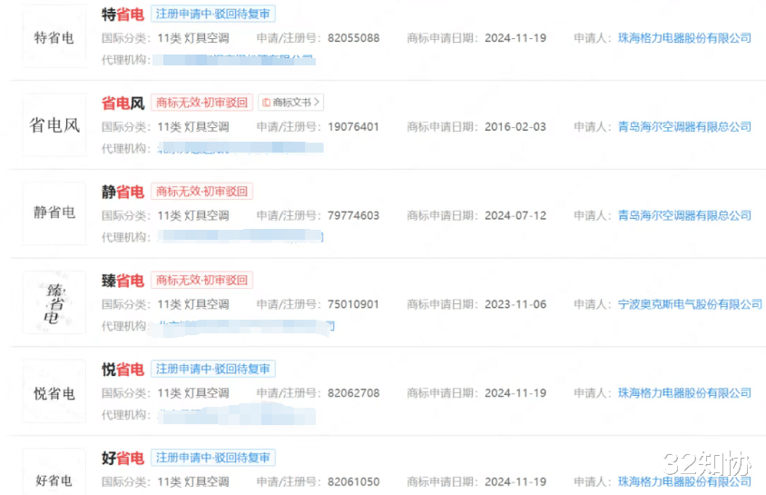 据了解,格力、美的、奥克斯等品牌曾申请“特省电”“省电王”“省电星”“悦省电”“臻省电”等商标,但多数被驳回或无效,反映行业对省电营销的争夺及监管限制。