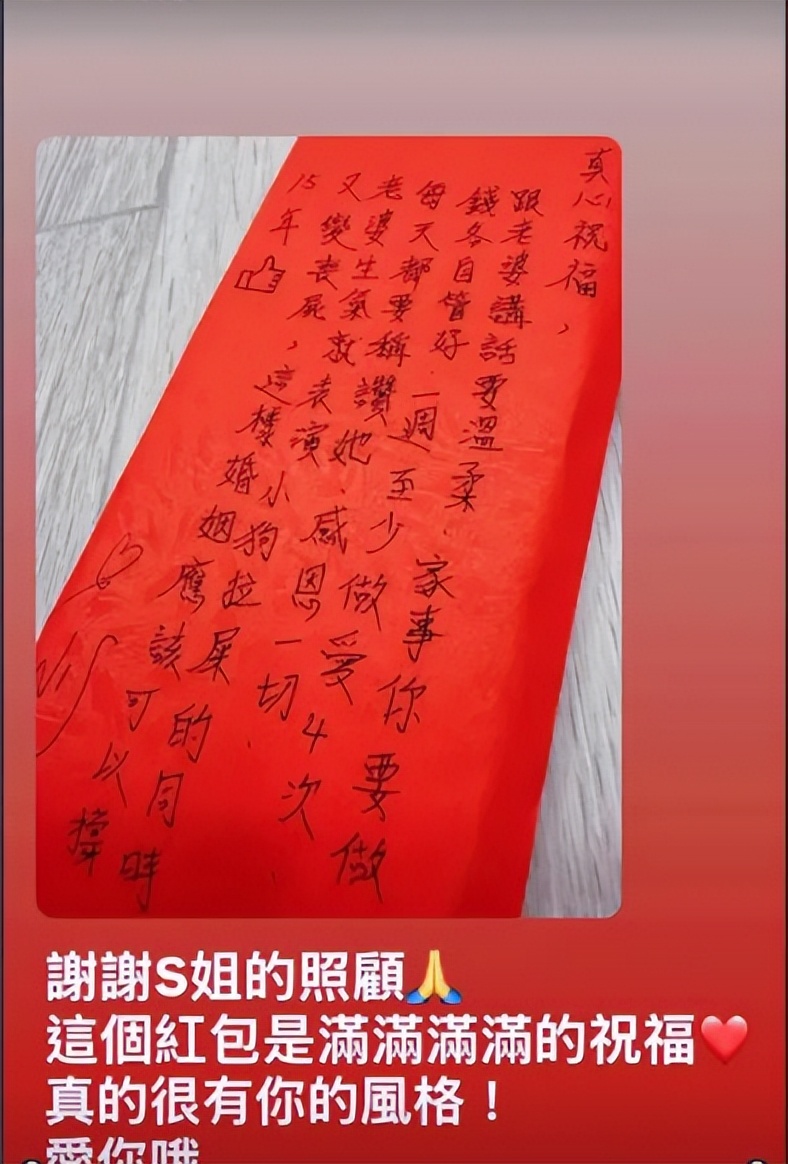 她在红包上手写了一堆婚后建议,什么"跟老婆讲话要温柔"、"家事你要做"、"一周至少四次"之类的,特别有小S的风格。