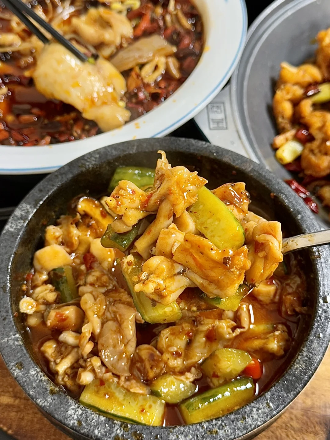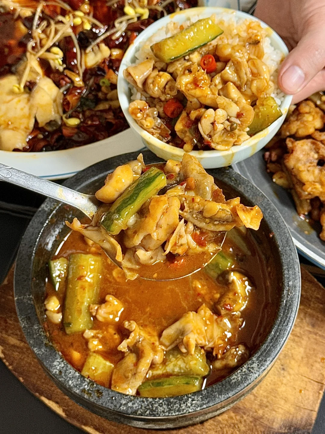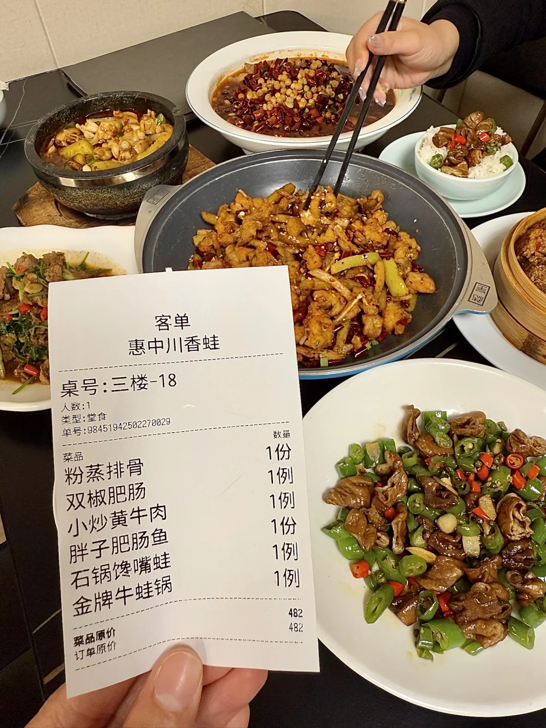 上桌的时候还在沸腾🔥蛙蛙真的太美味了!! 蛙肉入口鲜嫩,然后汤汁拌饭巨巨下饭连干好几碗! 还有粉蒸排骨、金牌牛蛙锅🏅肥肠鱼🐟小炒黄牛肉🥩都很下饭!是我和朋友愿意去无数次的小破店!