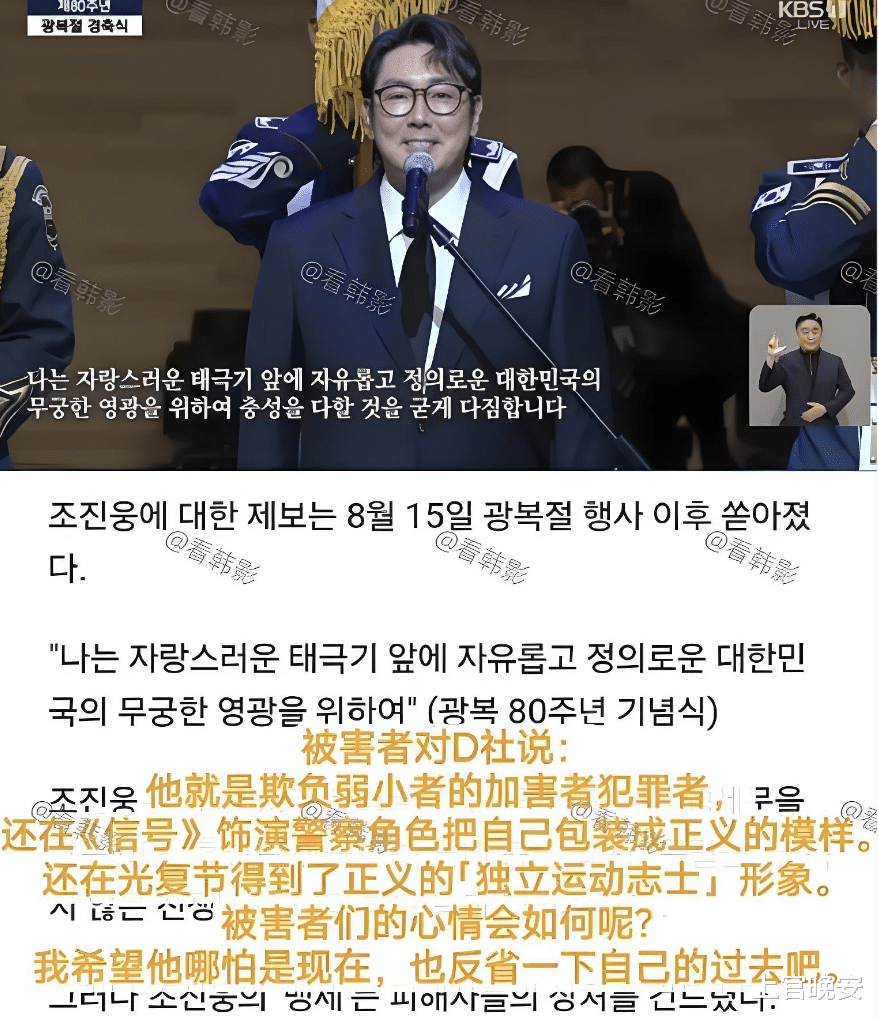 更让受害者感到愤怒的是,赵震雄以代表的身份参加了今年8月15日韩国光复节(国庆节)活动,并进行了动情的宣誓,正面形象得到进一步巩固。
