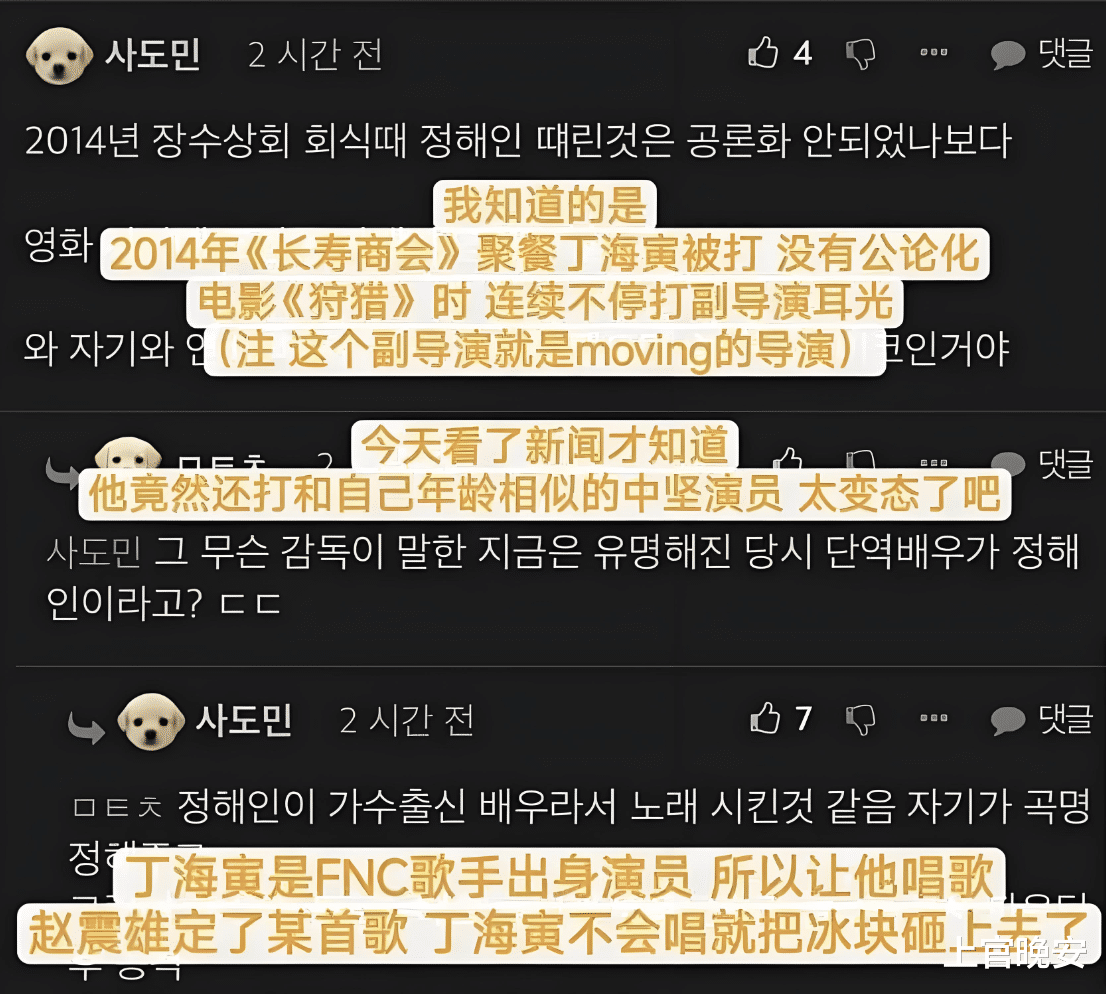 入行后曾酒驾被吊销驾照,只是那时候他还没什么名气,事态没有进一步扩大。成名后霸凌新人演员,丁海寅在一次聚餐中被赵震雄用冰块砸脸,只因不会唱赵震雄点的歌。