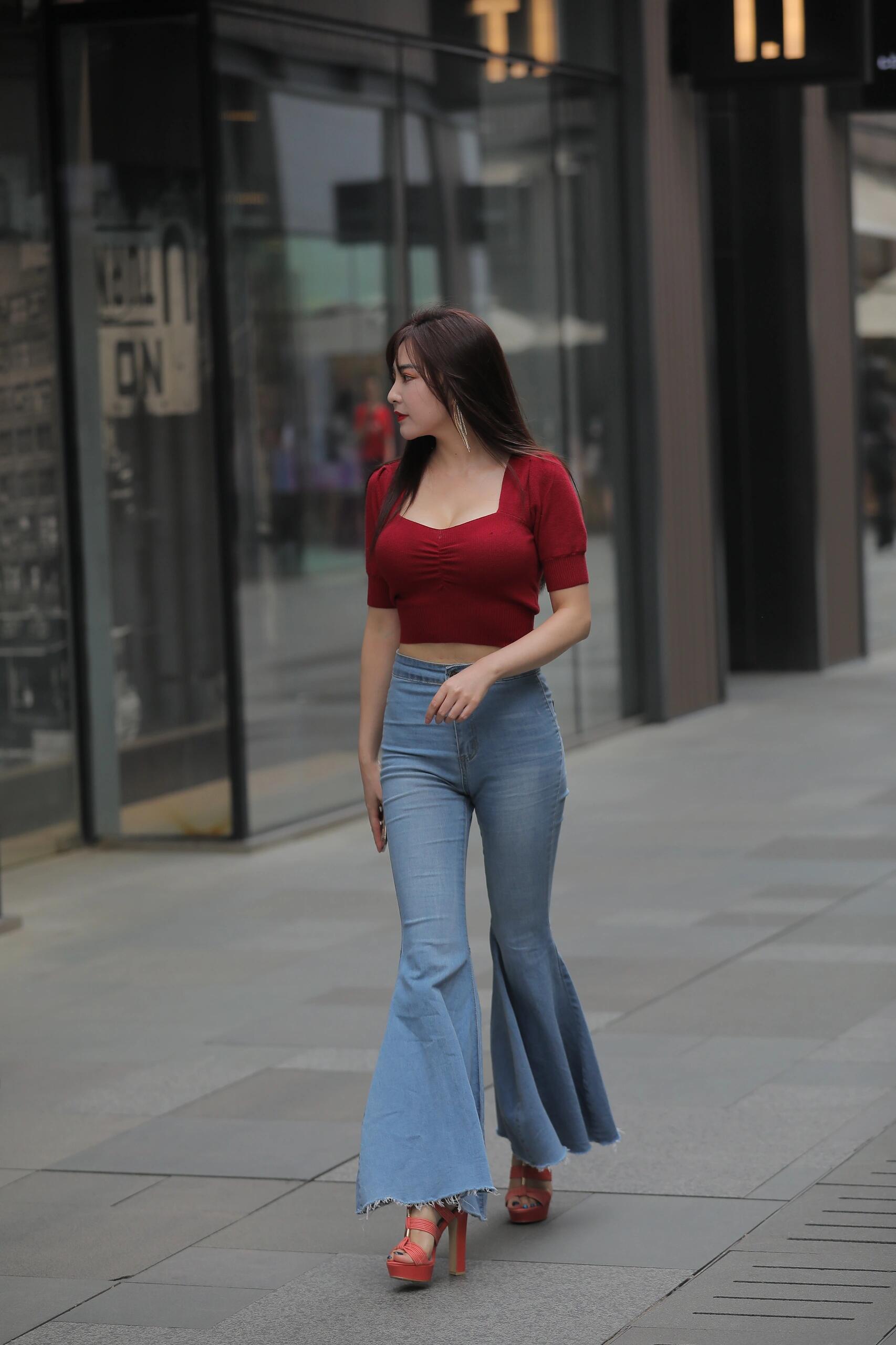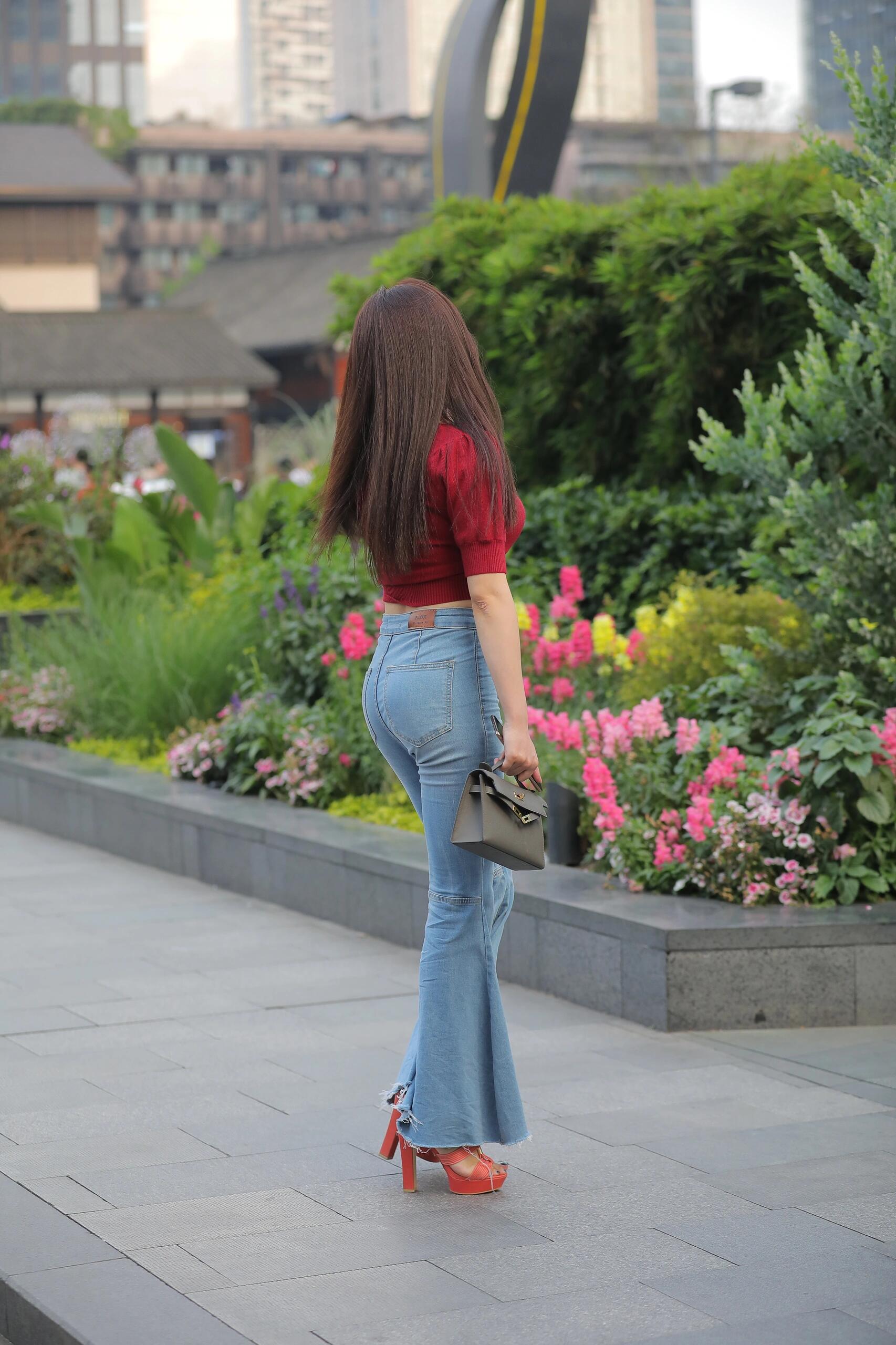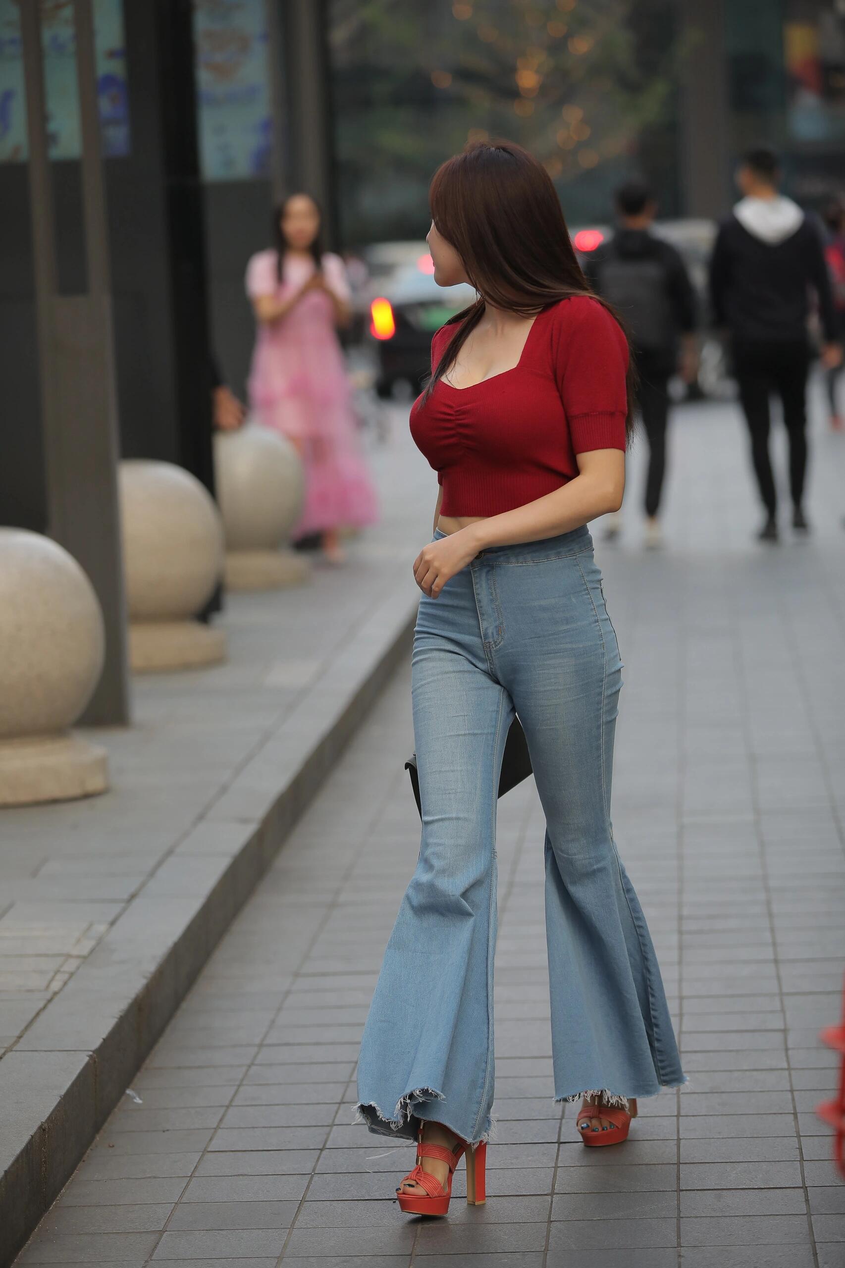 喇叭裤最大的优点就是走路带风,浅蓝色的牛仔面料清爽又复古,毛边裤脚增加了穿搭的层次感。搭配红色上衣,复古港风的氛围感直接拉满,日常出街这么穿,你就是时尚~