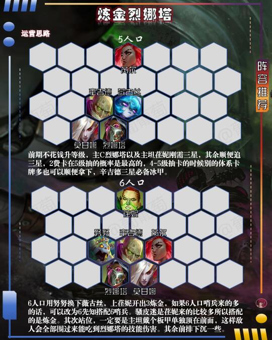 [星R]关于运营:详细的运营见P3-4图解(一定要仔细看!)。前期不花钱升等级,主C烈娜塔以及主坦荏妮刚需三星,其余顺便追三星,2费卡在5级抽的概率是最高的,4-5级抽卡的时候别的体系卡牌多也可以顺便拿下,辛吉德三星必备冰甲。如果6人口哨兵来的多的话,可以改为6先知搭配6哨兵。骚皮迷是荏妮来的比较多所以搭配的是炼金。其次站位,一定要是主坦戴个板甲单独顶在前面,这样敌人会全部围过来能吃到烈娜塔的技能伤害。其余前排下沉一些。追出三星烈娜塔后升7级,后续补充体系牌即可。