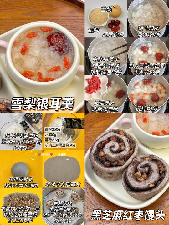 ✅雪梨银耳羹+黑芝麻红枣馒头