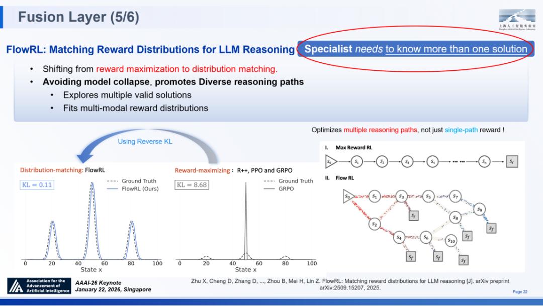 传统 RL 方法生成的分布与目标分布之间的 KL 散度高达 8.68,表现为极端的尖峰,意味着模型探索空间的极度狭窄。为了赋予模型真正的专家级思维多样性,我们在融合层引入了 FlowRL⑩,这是一项借鉴生成流网络(GFlowNets)思想的创新工作,标志着强化学习优化逻辑的范式转变。