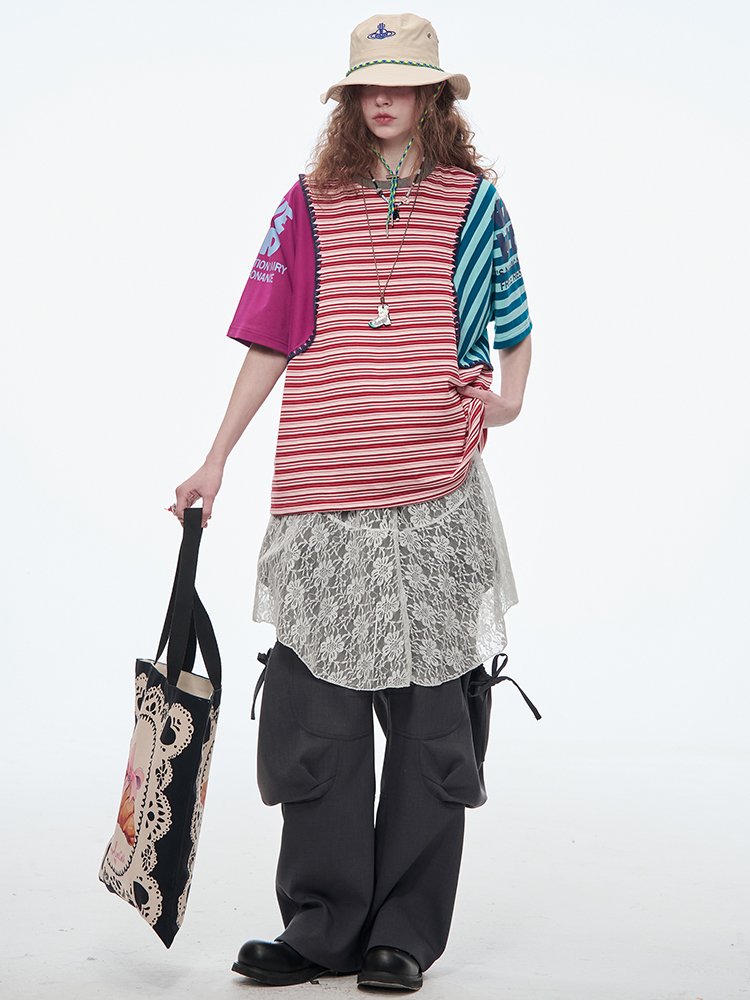面料有弹力,舒适透气;大身由多种面料拼接,色彩丰富;版型宽松舒适,袖笼结构处做三角针设计,袖片部分做字母印花 风格:休闲-百搭 颜色:条纹红色
