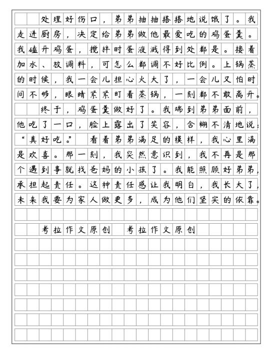 《那一刻,我长大了》五年级下册一单元作文独自照顾弟弟。我能照顾好弟弟,承担起责任。这种责任感让我明白,我长大了,未来我要为家人做更多,成为他们坚实的依靠。