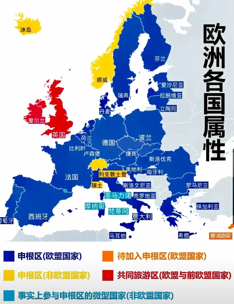 欧洲申根区国家大揭秘,一个小小的欧洲竟然在是否申根国家上分的五花八门,也难怪战争来临时,他们会各自为战,被逐一击破!