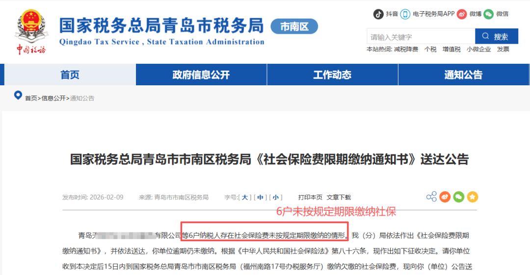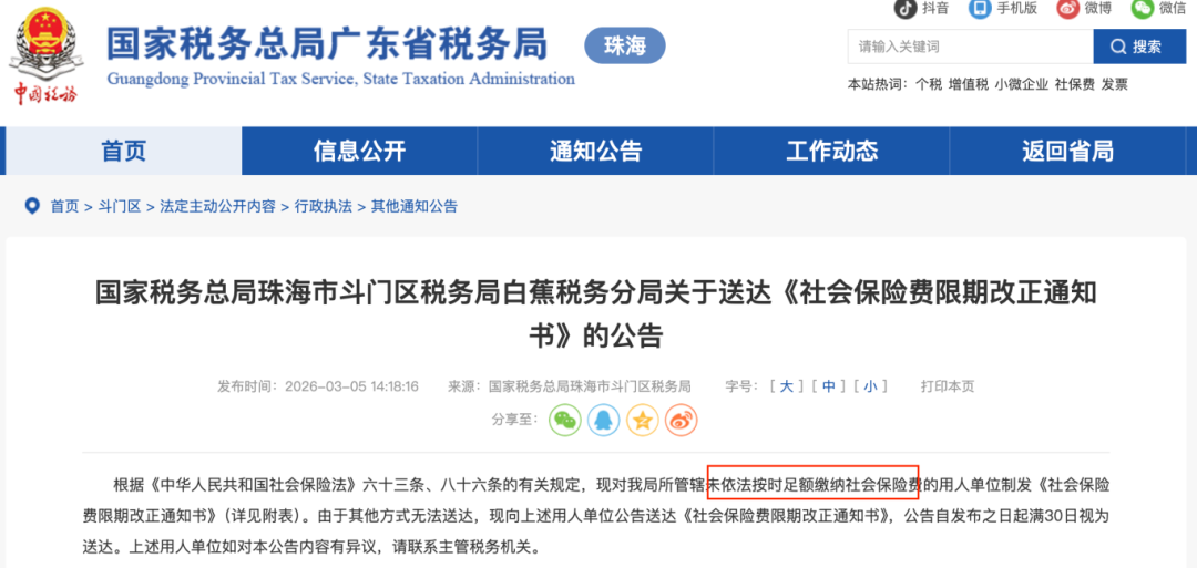 2026年起,税局已公告多家企业关于社保费用责令限期改正通知书: