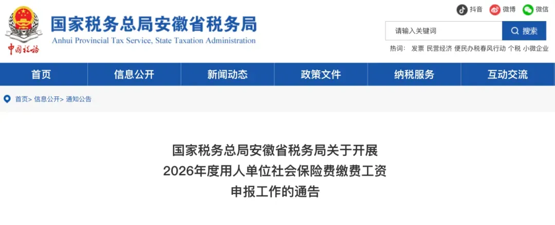 安徽省发布《关于开展2026年度用人单位社会保险费缴费工资申报工作的通告》