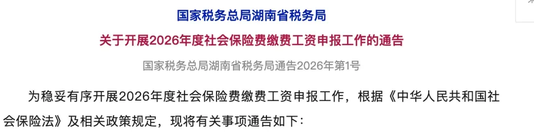 湖南省发布《关于开展2026年度社会保险费缴费工资申报有关事项的通告》。