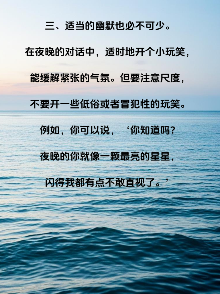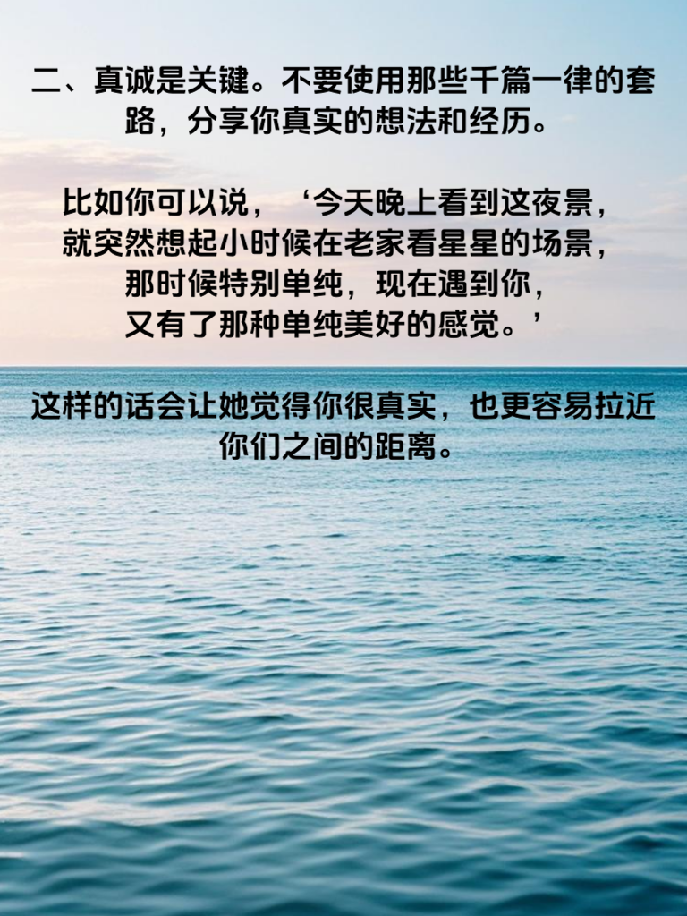 一、夜晚,总是带着一种独特的氛围,适合深入的情感交流。要高效撩拨女生心弦,首先得学会倾听。当她说话时,停下手中的一切,专注地看着她的眼睛,让她感受到自己是被重视的。很多男生急于表达自己,却忽略了女生的感受,这是大忌。 二、真诚是关键。不要使用那些千篇一律的套路,分享你真实的想法和经历。比如你可以说,‘今天晚上看到这夜景,就突然想起小时候在老家看星星的场景,那时候特别单纯,现在遇到你,又有了那种单纯美好的感觉。’这样的话会让她觉得你很真实,也更容易拉近你们之间的距离。 三、适当的幽默也必不可少。在夜晚的对话中,适时地开个小玩笑,能缓解紧张的气氛。但要注意尺度,不要开一些低俗或者冒犯性的玩笑。例如,你可以说,‘你知道吗?夜晚的你就像一颗最亮的星星,闪得我都有点不敢直视了。’