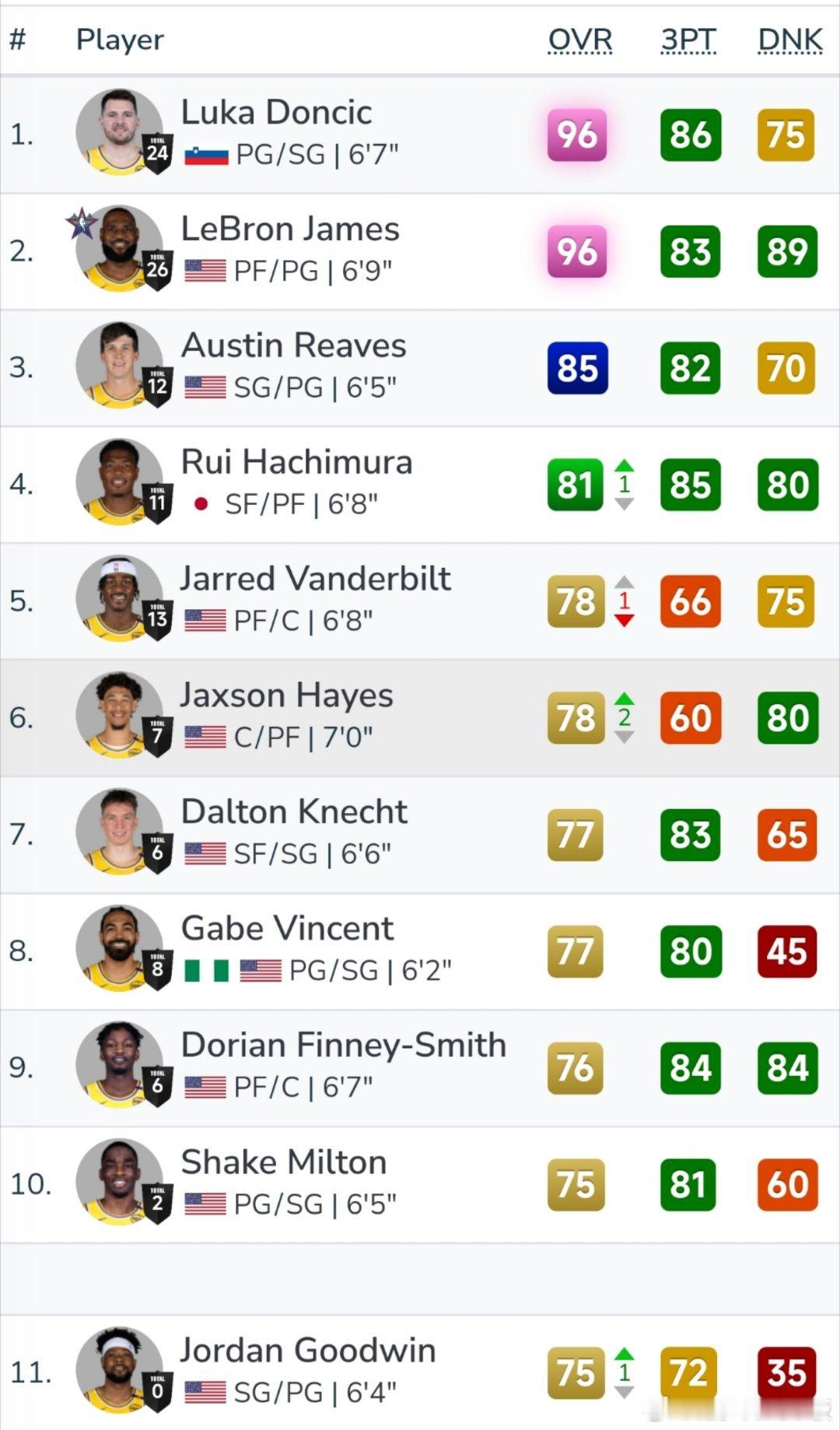 2K25官方更新球员能力值,湖人此次共有4名球员能力值调整,3升1降✏️