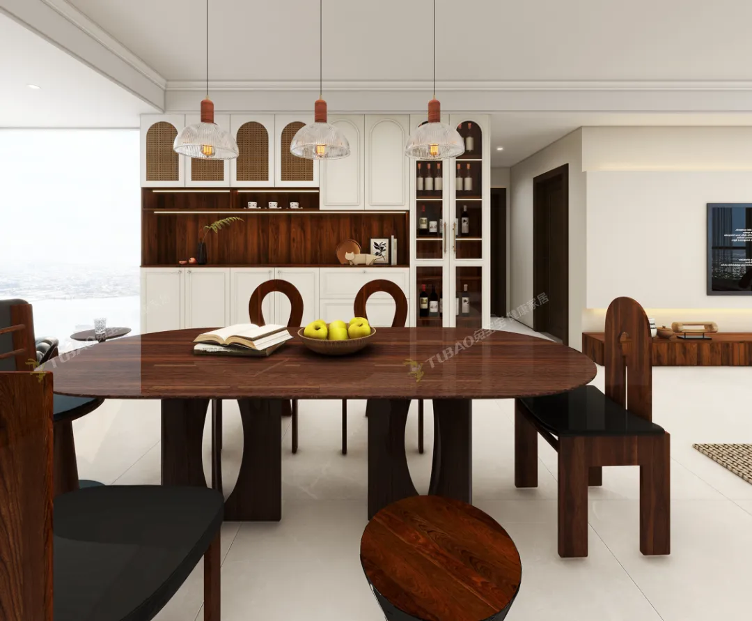 客餐厅采用了一体化设计,营造出开阔而流畅的空间感。客厅区域保留了电视机,它被简洁地悬挂在墙面上,而墙面则采用了留白处理,这种经典的黑白配色不仅彰显出高级质感,还透露出不凡的格调与品味。