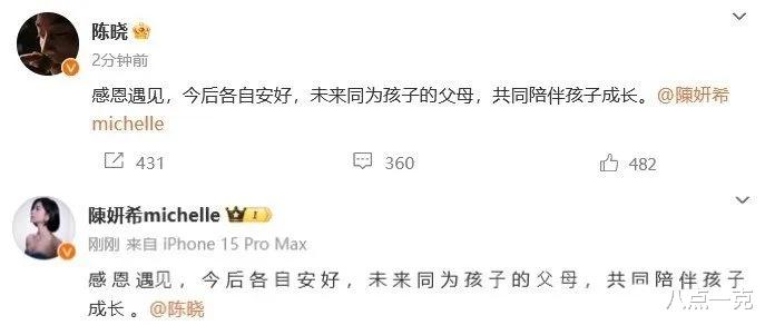 还有狗仔爆料,两人在2023年就已经提出来离婚,陈晓为了能和陈妍希离婚,还表示愿意净身出户,关于离婚的理由陈晓并没有透露。
