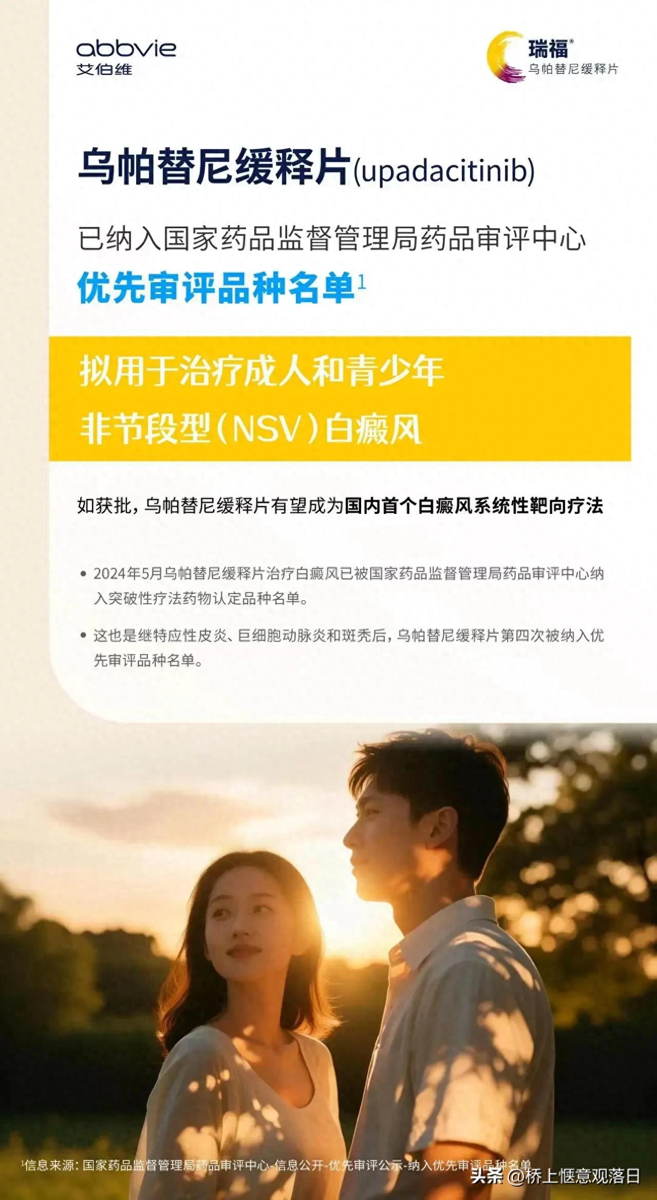 艾伯维发布最新消息:乌帕替尼缓释片治疗成年及青少年白癜风被纳入国家药品审评中心优先审评品种名单。