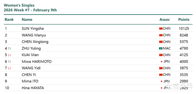 最新女单世界排名前十的运动员与变化为:孙颖莎、王曼昱、陈幸同、朱雨玲(上升1名)、蒯曼(下滑1名)、张本美和(上升1名)、王艺迪(下滑1名)、陈熠、伊藤美诚、早田希娜,依旧是中日选手平分秋色。