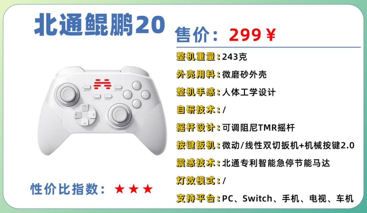 摇杆与按键的反馈偏平衡,中规中矩,不会太松也不会过硬,适合动作冒险、休闲、平台跳跃、RPG 等多类型游戏。鲲鹏20 的优势在于兼容性较广,既支持 PC 与安卓设备,也可通过适配器用于主机或模拟器,对兼容需求不高但希望稳定使用的人来说较适合。不过它不具备额外的高级特性,振动反馈较弱,按钮触感也更偏基础。如果你对震动感、不对称扳机压感、触觉反馈、可编程按键等高级体验不追求,鲲鹏20 作为入门手柄性价比很高。适合轻度玩家、轻量游戏玩家、复古游戏爱好者,尤其是预算有限又想尝试手柄的朋友。