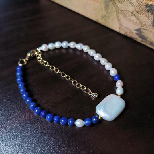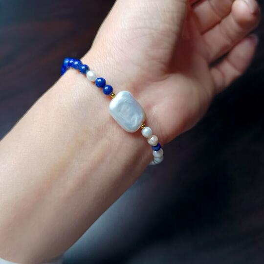 💫青金石x白珍珠|能量磁场手链玄机🔮 青金石:对应喉轮与眉心轮,助沟通清晰、灵感迸发,古称「帝王石」招贵人避是非。 白珍珠:属太阴精华,柔和水能量,调和情绪,旺女性魅力与家庭和谐。 五行相生:青金(水/土)+珍珠(水)|水生木旺财运,土生金稳气场。 适配人群:补水增加灵性派、职场谈判者,左手佩戴引宇宙能量🌌