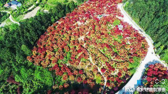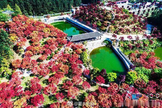 【航拍重庆五洲园红枫林 层林尽染美到心醉[色]】重庆市巴南区五洲园的红枫林迎来盛放期,形成一道靓丽的反季节美景,吸引众多游客前往观赏体验。[酷]又到周末啦,要不要约一个?