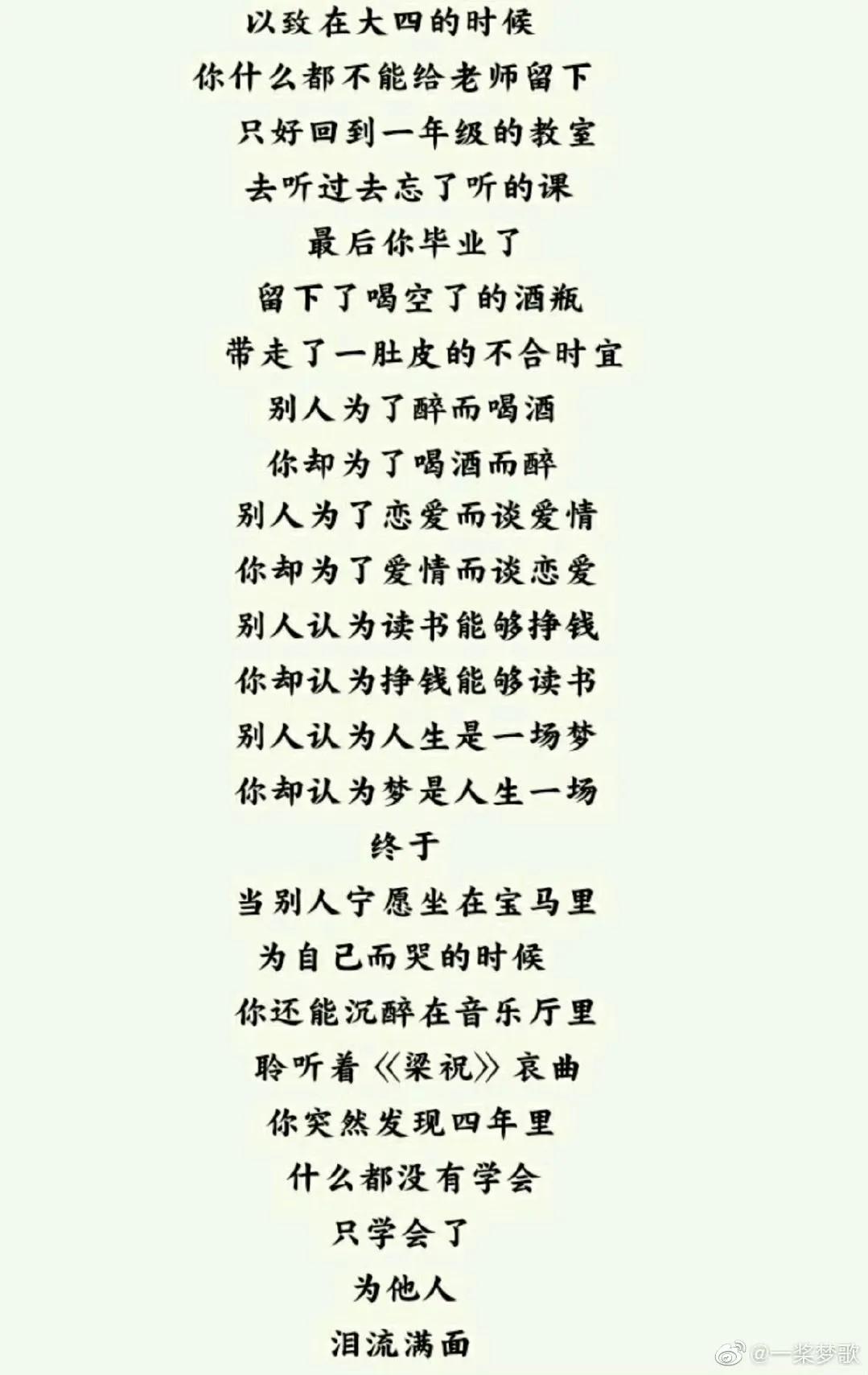 我同学前一阵子在课上读过,今天我又和一个学中文的好友聊起,他在企业做高管多年,偶尔还会写几句,他说:“纵然为落寞而作的诗,也有一如永恒的热忱。即使我最后也只学会了泪流满面,但从不后悔文学带来的人间清亮。”