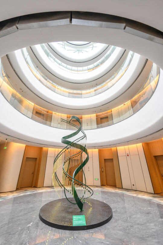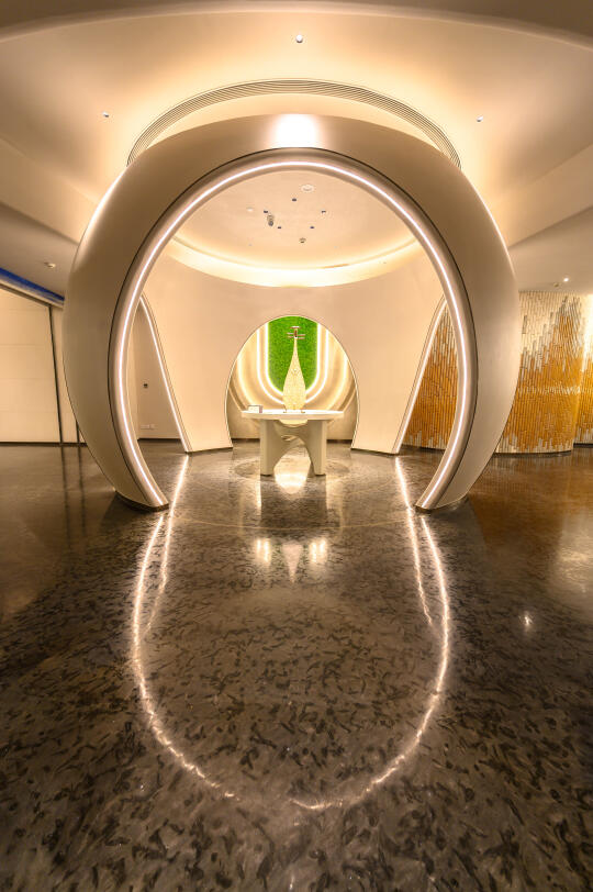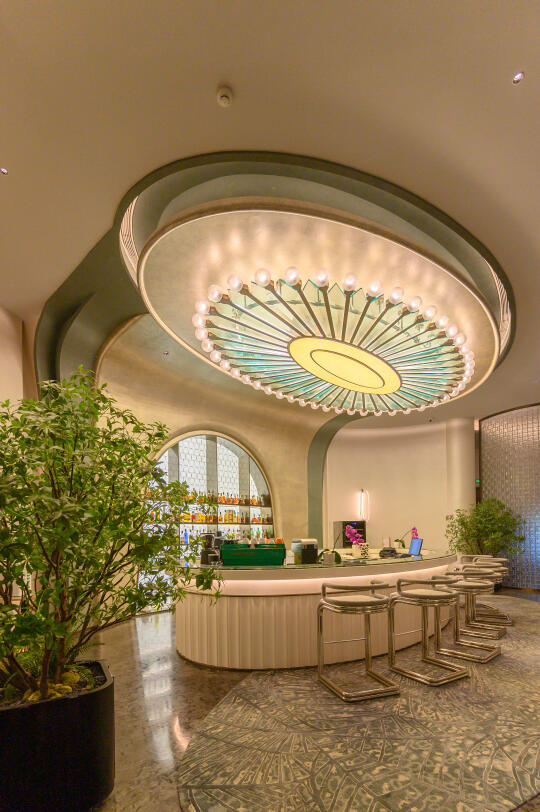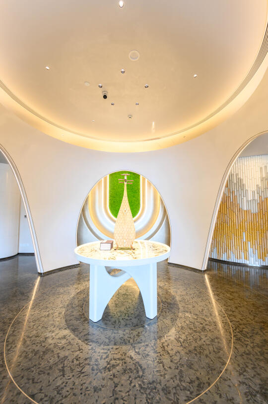 酒店内推荐打卡点有很多,我个人比较喜欢的户外部分有大地剧场、禅意亭、方框水幕等。室内的有图书馆、无上 &有方、畅音台、渡光舟等。我每天去房间都能看到悬觞曲,柔美的线条。它自曲禅里的圆庭生长而出,灵感来源曲水流觞,生息流淌。如音符交汇让音与光的构成一幅无声画卷,平衡自然,感受曲与禅的和谐共鸣。